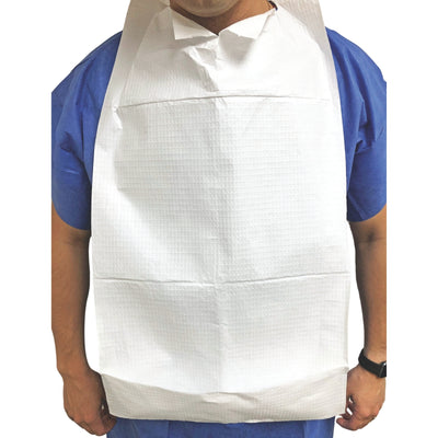 Measuring 70cm x 37cm, each bib is equipped with a perforated neck tie for easy, adjustable wear, and features a 10cm crumb catcher to further prevent food debris from spilling onto clothing. Perfect for use in hospitals, nursing homes, and other care environments, these bibs eliminate the need for laundering, making them a cost-effective and time-saving solution for patient care.