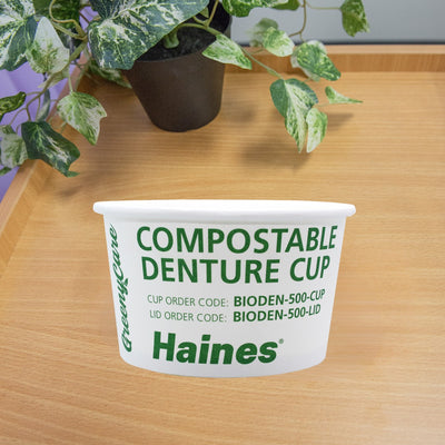 The GreenyCare Compostable Denture Cup with optional Lid is designed for soaking dentures, with the ability to contain water (hot or cold) for 24 hours4 and denture cleaning solution for up to 5.5 hours5 with no leakage. The cup fits whole dentures and has a secure, recyclable lid that ensures contents are kept in a hygienic manner.